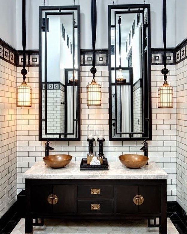 In a 1920s bathroom, it feels crisp and intentional. Checkerboard floors, dark trim, or black framed mirrors all bring contrast without clutter. If it feels too sharp, warming it up with brass accents softens everything beautifully.