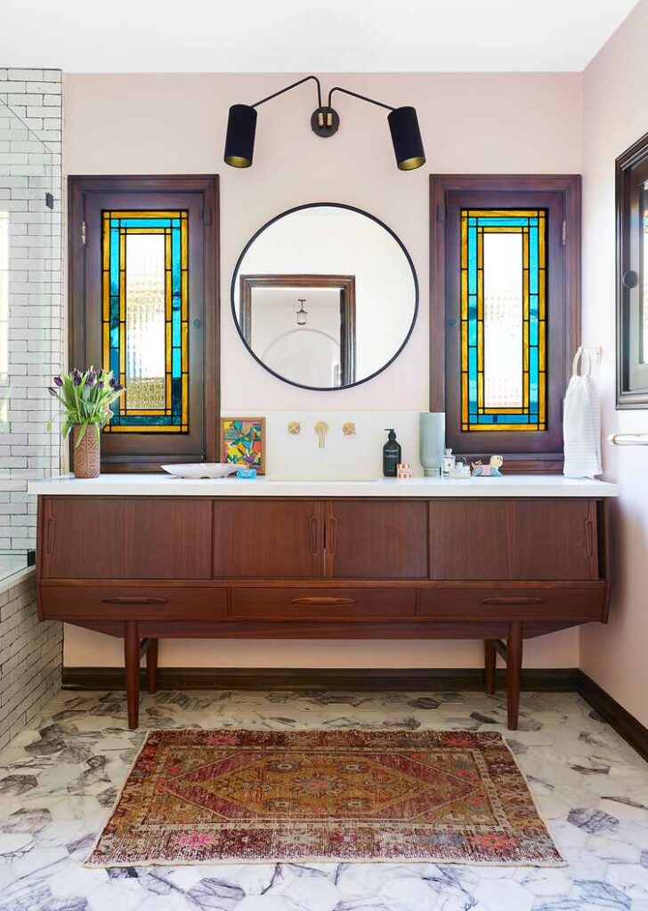Start with swaps that visually signal the era. Change your mirror to something vintage framed, update hardware to brass or chrome, and add Art Deco lighting if possible. Wallpaper on one wall can do a lot without major work. Even smaller details like a retro shower curtain, glass jars for storage, and framed vintage prints help sell the look while keeping your current layout and fixtures.