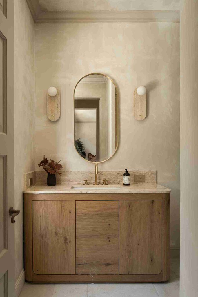 For an extra touch of elegance, choose a brass-framed mirror or a brass chandelier to serve as focal points in the space. Brass also works well when paired with beige marble or textured beige tiles, offering a timeless appeal that’s both elegant and warm.
