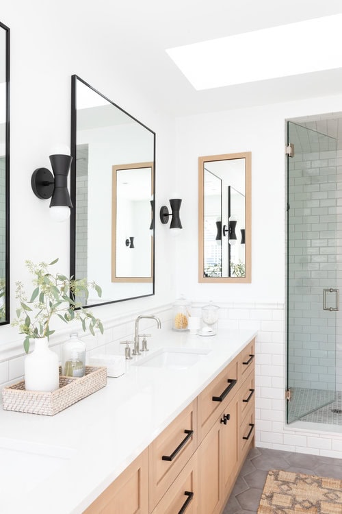 Add silver-framed mirrors, silver towel racks, and polished silver faucets for a chic and modern bathroom design. To keep the space from feeling too cold, incorporate soft beige rugs, towels, and other textiles that will maintain the inviting warmth of the room while adding the luxurious shine of silver.