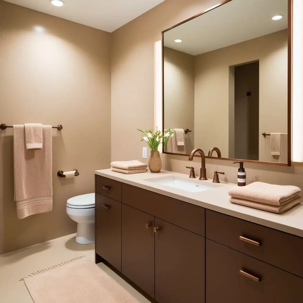 This combination works particularly well in larger bathrooms, where the dark accents can help break up the light tones and create visual interest. Ensure the beige remains the dominant color to keep the space feeling warm and welcoming, while the dark accents add a touch of sophistication.