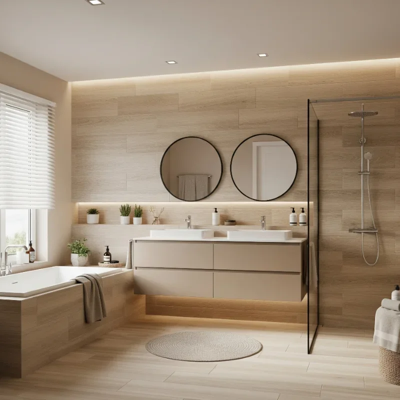 Combining beige with natural wood tones is an excellent way to create a warm, inviting, and organic bathroom. The earthy quality of wood perfectly complements beige, creating a harmonious balance between modern and rustic styles. Wooden shelving, mirrors, or flooring will give your bathroom a relaxed yet sophisticated feel.