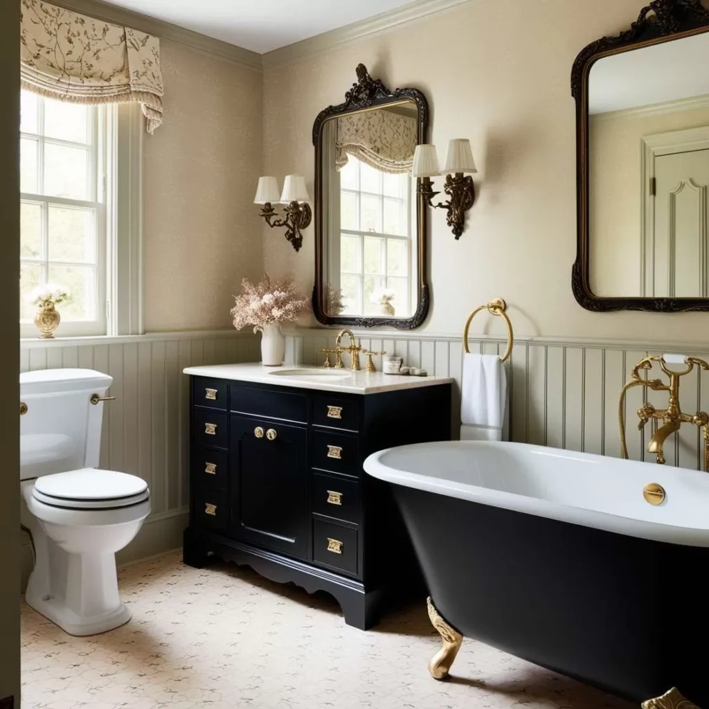 If you prefer a subtler approach, you can use black in smaller doses, such as in the form of black-framed mirrors, dark tiles in the shower, or black lighting fixtures. The key is to ensure that the beige remains the dominant color, while black accents add depth and sophistication.