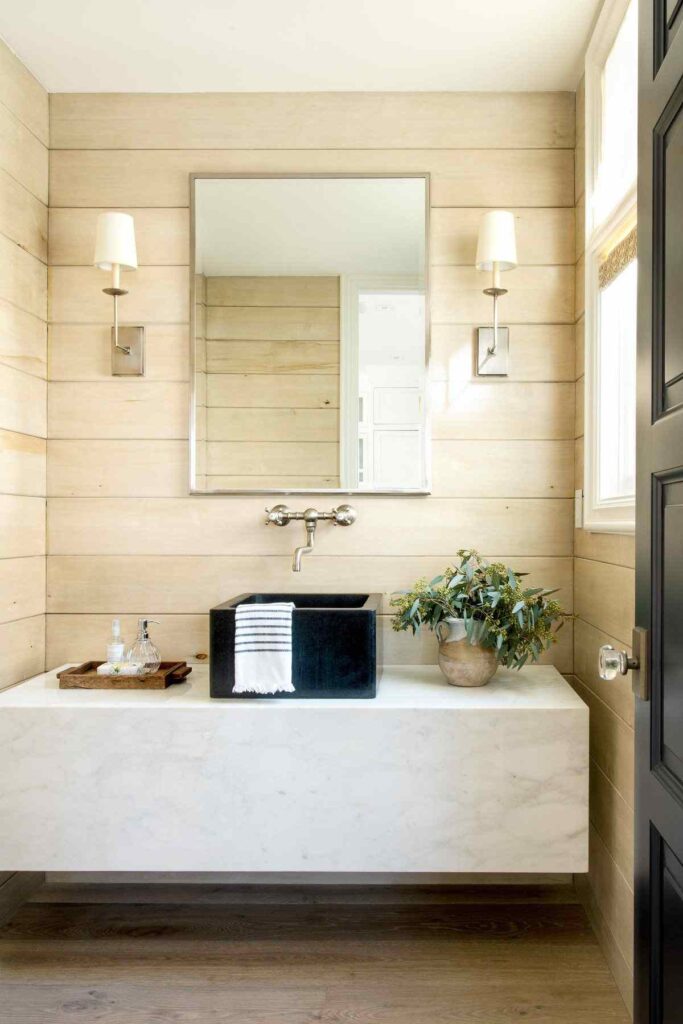To enhance the coastal vibe, add natural wooden elements, such as a driftwood mirror or a wicker laundry basket, alongside the beige and white shiplap. This combination is especially ideal for bathrooms with plenty of natural light, where the soft hues can bounce off the walls and create a refreshing ambiance.