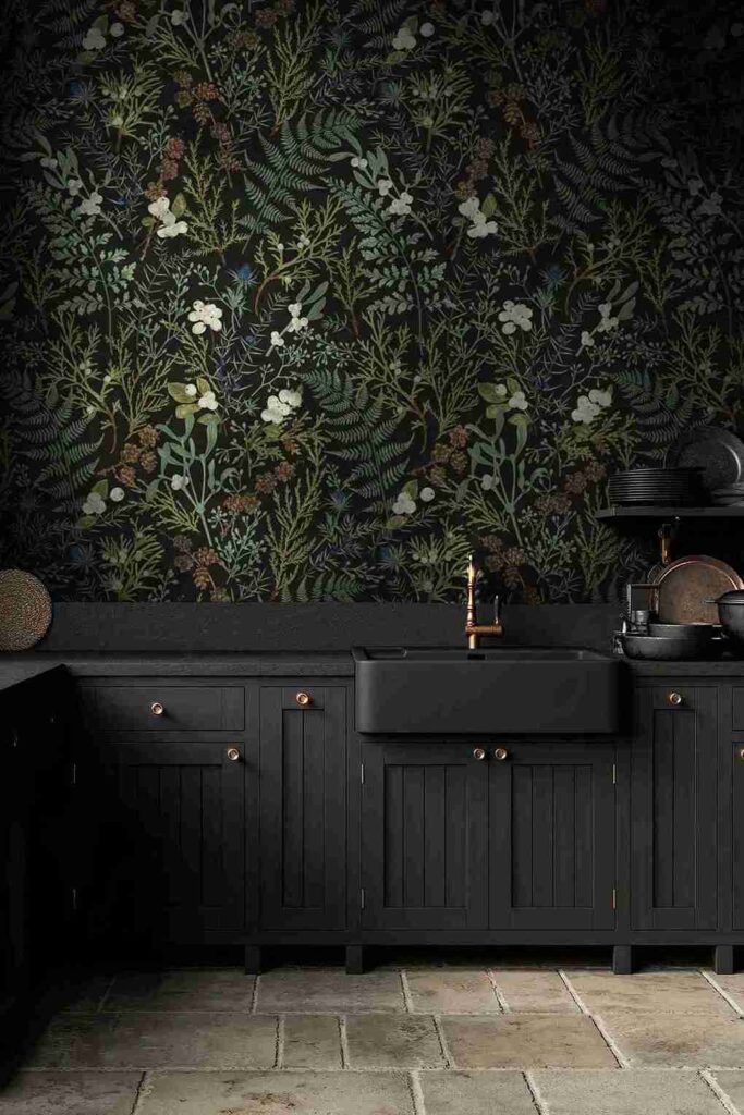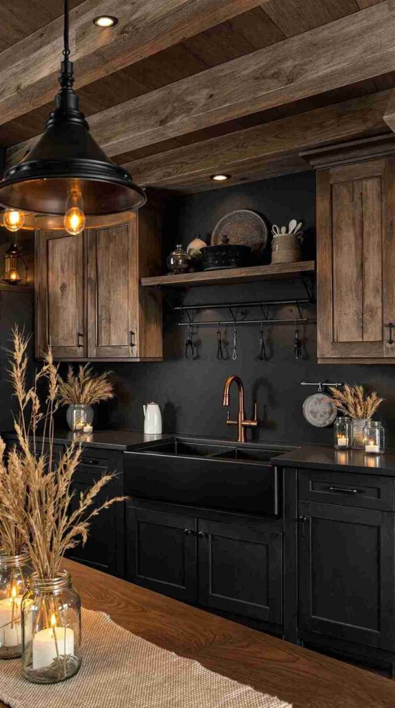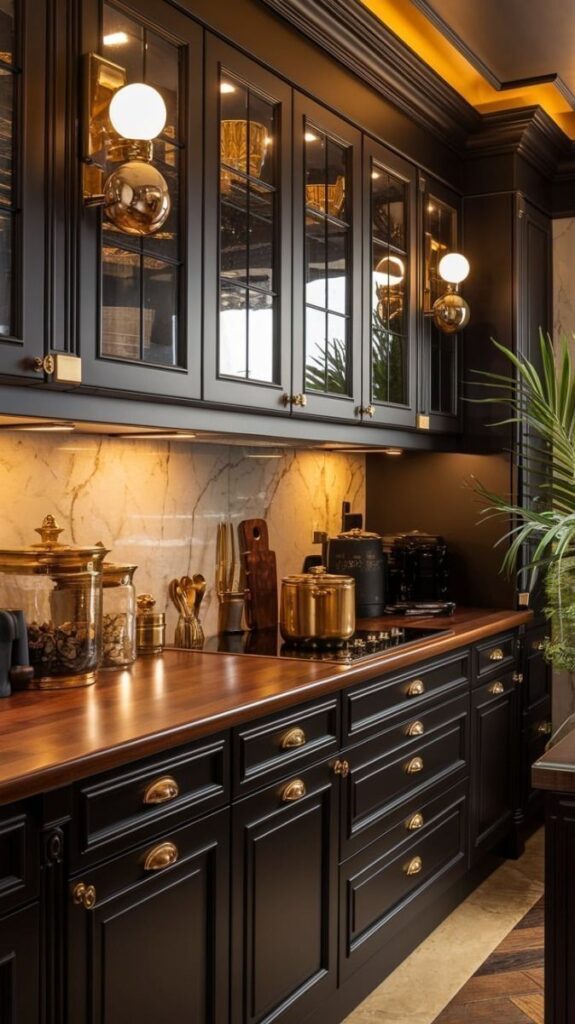 Adding a few plants and wooden utensils, as seen in the image, softens the look and brings warmth to the design. It’s all about balance—combining dark elements with lighter or natural materials can create a harmonious environment for culinary adventures.