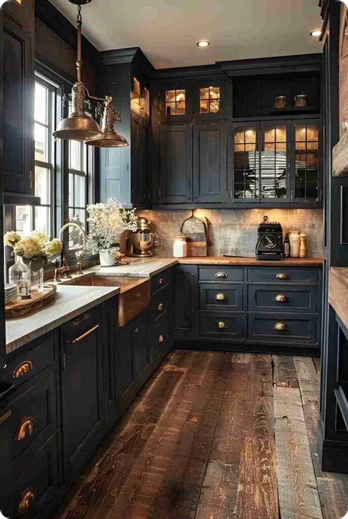Lighting plays a major role here. Warm under-cabinet lighting, pendant fixtures over the island, and subtle reflective surfaces prevent the space from feeling dim. Instead of relying solely on brightness, dark kitchens focus on atmosphere.