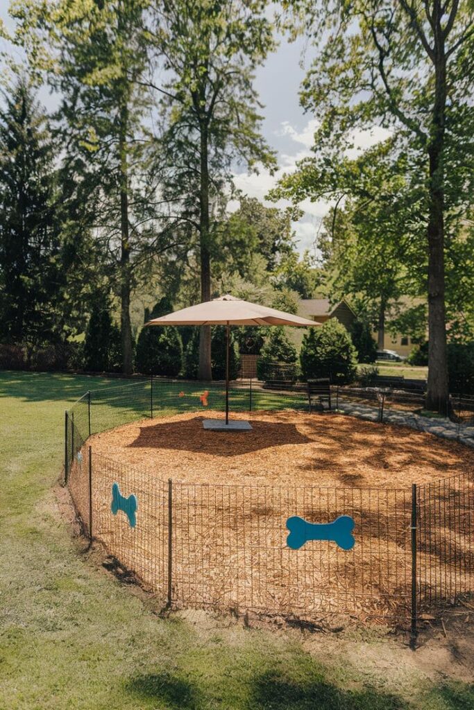 This clever setup features a perfectly rounded area filled with thick cedar mulch and enclosed by a simple wire mesh fence. The design works because the circular shape breaks up the linear lines of a traditional yard, while the tan sun umbrella provides a stylish focal point.