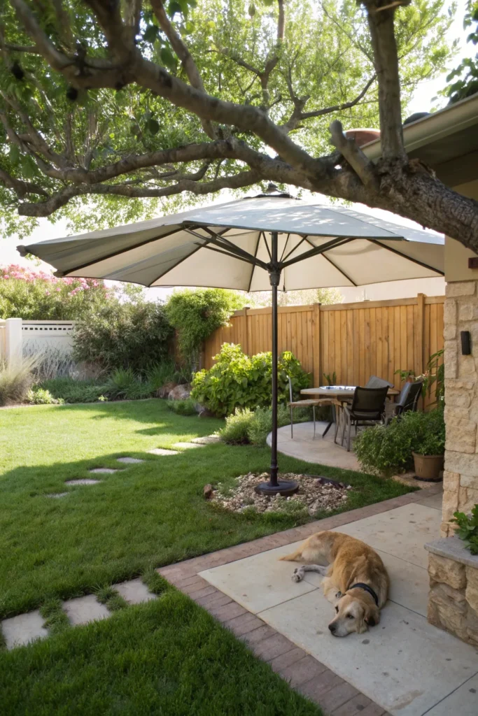 This space prioritizes the human-dog bond by placing a large umbrella and stone path right next to the dog’s favorite nap spot. The use of stepping stones through the grass prevents muddy paws while adding a classic cottage-style look.