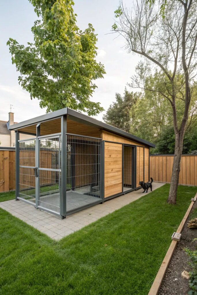 This striking design features a slanted black metal roof and horizontal wood siding for a truly contemporary look. The concrete patio transition makes it easy to clean, while the adjacent grass gives the dog a soft place to roll.