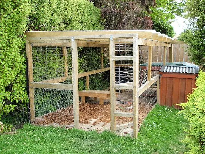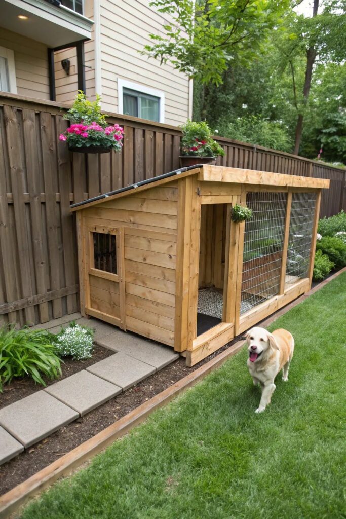 Tucked against a tall privacy hedge, this DIY run uses reclaimed-style wood and a simple corrugated roof. The ground is covered in natural wood chips, which are soft on paws and blend perfectly with the surrounding trees.