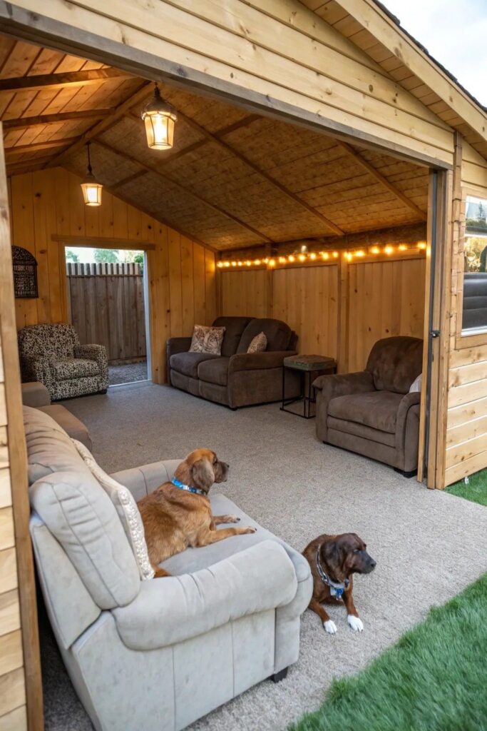 This incredible “dog cave” features a fully furnished interior with sofas, carpet, and warm string lights. It opens directly onto a grassy area, allowing dogs to choose between a plush indoor nap or outdoor playtime.