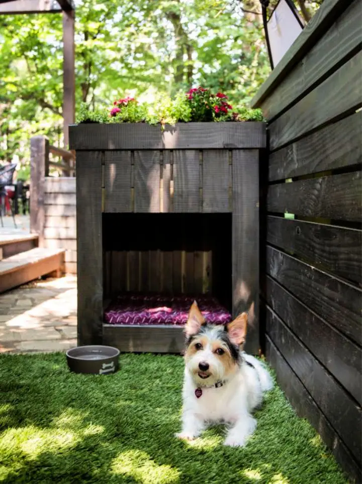 This ingenious design combines a cozy dog house with a living roof full of bright pink flowers. The dark stained wood gives it a high-end furniture feel that complements any modern patio or deck.