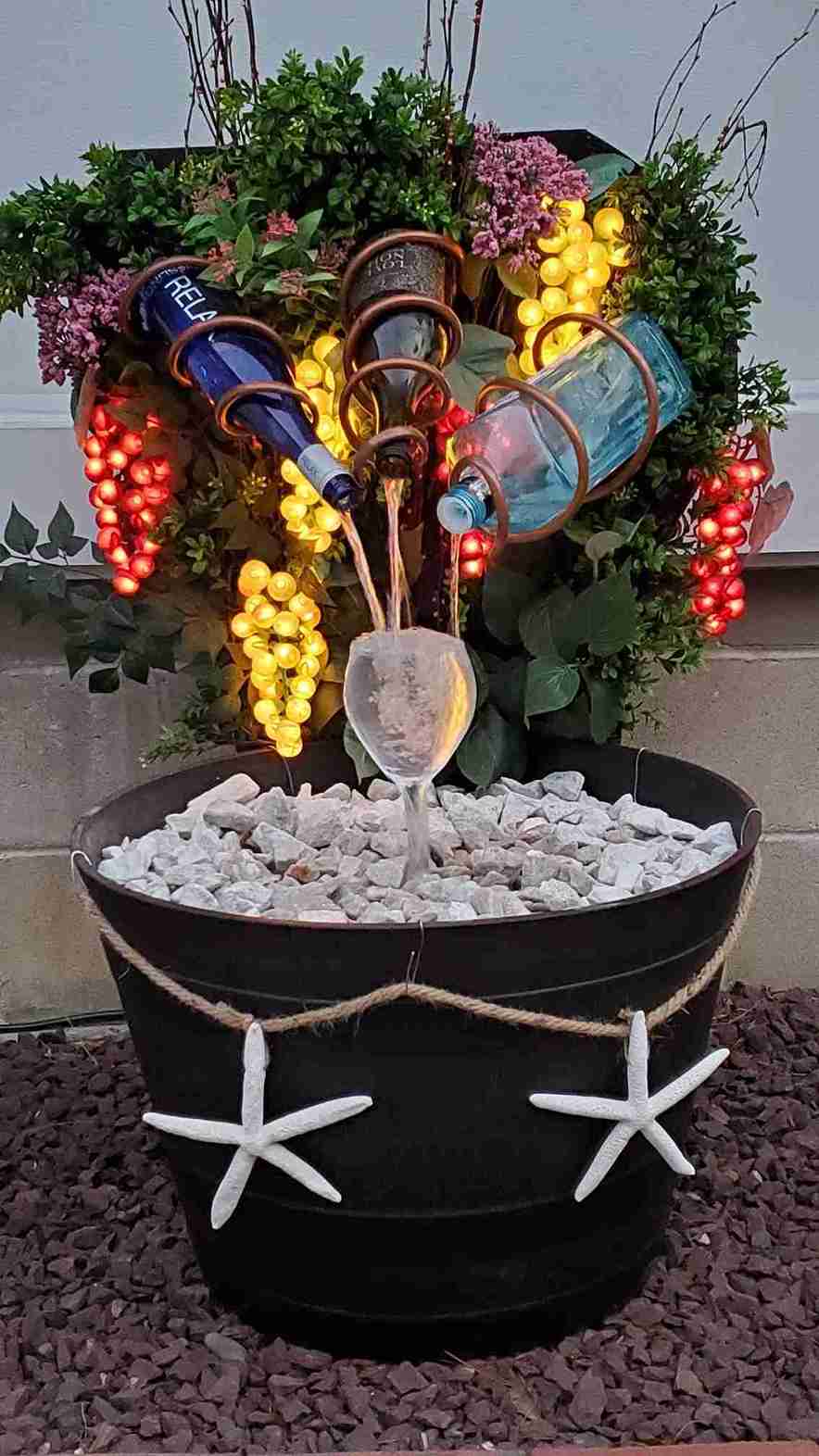 Upcycled glass bottle fountains add a whimsical, eco-friendly touch to your outdoor space. They work well in rustic, eclectic, or vintage-themed gardens and are an excellent conversation piece for outdoor gatherings.