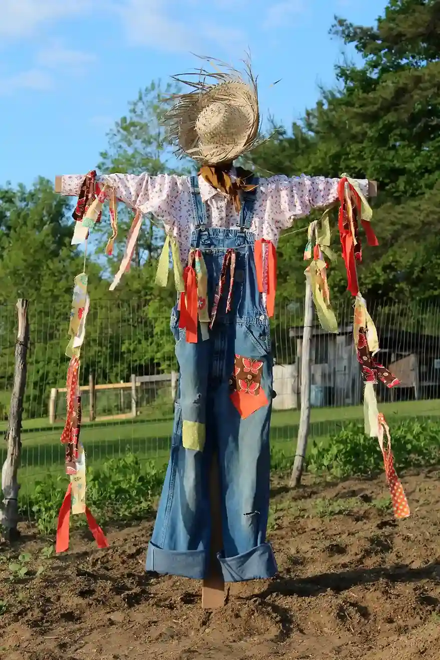 Combine art and function by crafting a scarecrow that doubles as a wind chime. Start with a sturdy frame made of wood or metal and dress it in flowing fabrics that can catch the wind.