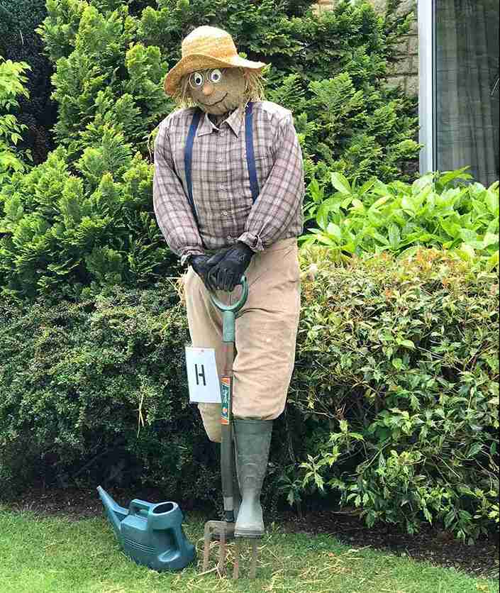 Let your scarecrow blend seamlessly into your garden by giving it a gardener’s look. Dress it in gardening gloves, an apron, and a wide-brimmed straw hat. Use seed packets, small tools, or a watering can as props.