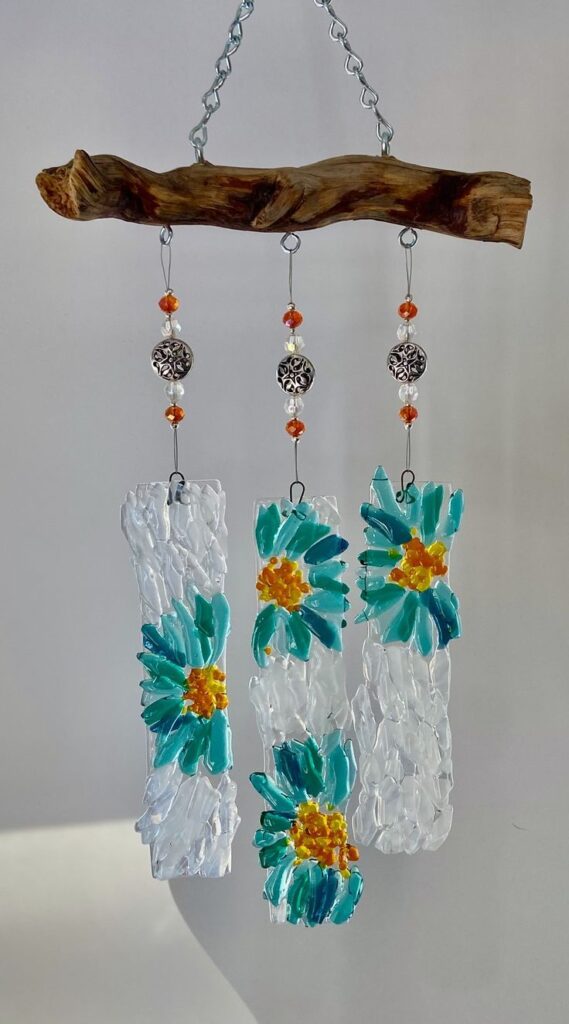 Arrange glass pieces into a design on kiln paper. Keep edges smooth and avoid stacking too thick unless you want a bolder shape. Fire according to the studio’s schedule, then let it cool completely. Add a hanging loop using wire wrap or a drilled hole (studio can often help). Hang it where the sun can light up the colors like candy.