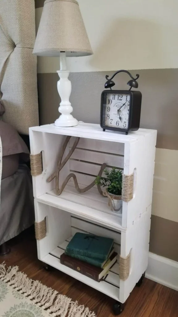 Two simple wooden crates are stacked vertically and painted a crisp, clean white to create a versatile bedside table. Jute rope is wrapped around the side handles to add a touch of organic texture, while small wheels on the bottom make it easy to move.