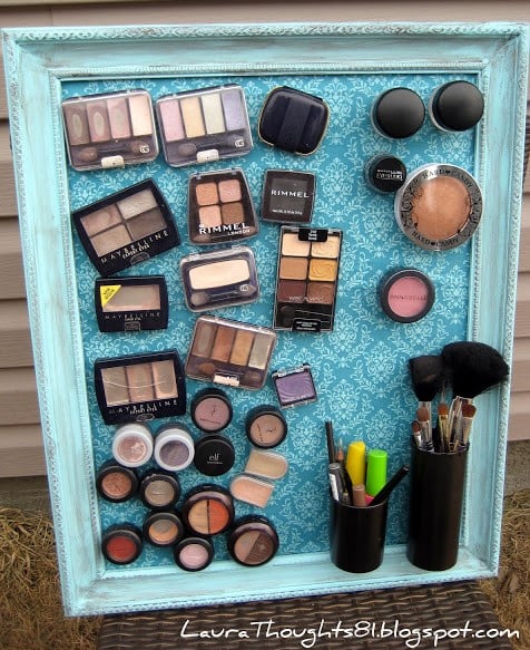 An ornate, light-blue vintage frame is fitted with a magnetic fabric backing to hold an entire collection of eyeshadows and blushes. A small black cup is attached to the side to keep makeup brushes upright and within easy reach.