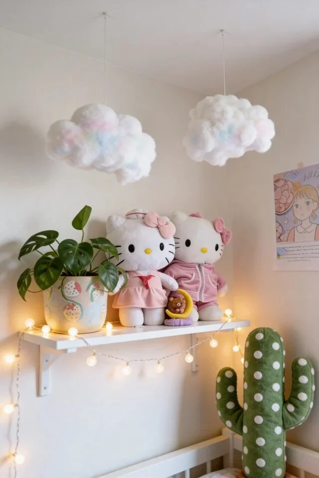 These fluffy, oversized “clouds” are suspended from the ceiling and glow with a soft, iridescent light from within. Below them, a white shelf holds adorable Hello Kitty plushies and a string of warm globe lights.