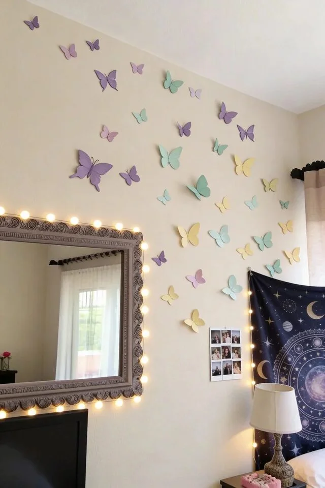Dozens of paper butterflies in shades of lavender, mint, and soft yellow appear to take flight across a cream-colored wall. They are arranged in a sweeping motion next to a large mirror framed in bright vanity bulbs.