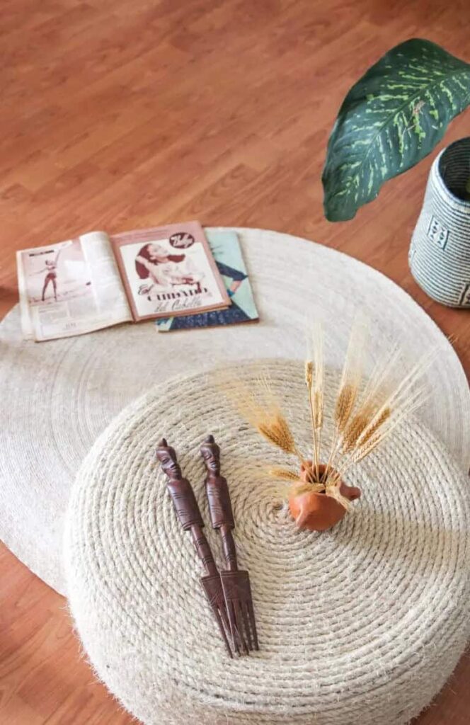 This low-profile seating option is created by tightly coiling thick jute rope around a circular base to form a textured ottoman. It sits on a matching large rope rug, topped with a small clay vase and decorative wooden carvings.