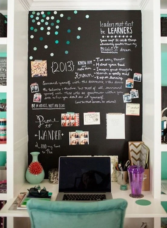 This desk area features a large floor-to-ceiling chalkboard wall that is completely covered in hand-written goals and Polaroid photos. A plush teal chair sits in front of a clean white desk, creating a vibrant and focused workspace.