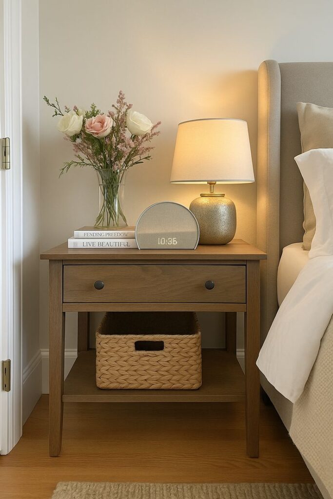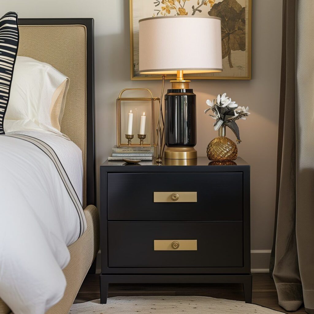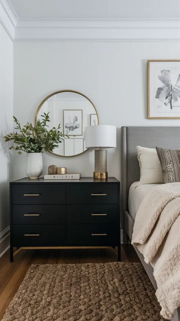 I once styled a room using one slim drawer nightstand on one side of the bed and a small round accent table on the other. It worked because both pieces were a similar height, used warm wood tones, and included black metal accents. Those shared elements created cohesion even though the shapes were different.