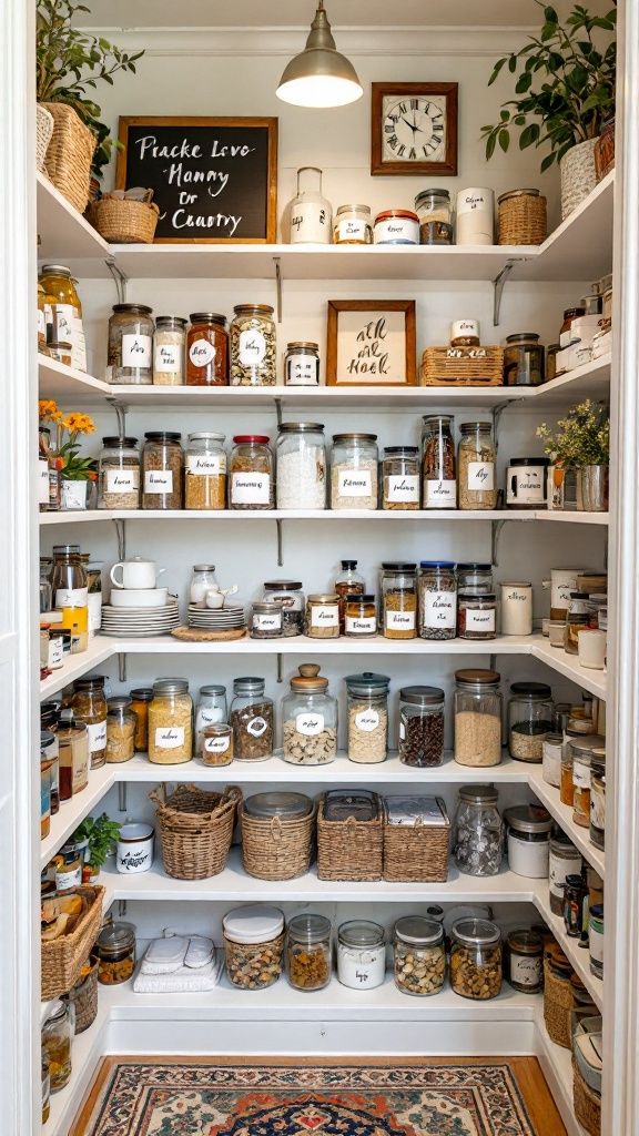Consider adding wooden spoons or small baskets for a rustic touch. This pantry is not just functional; it’s a delightful space that reflects your style and love for cooking.