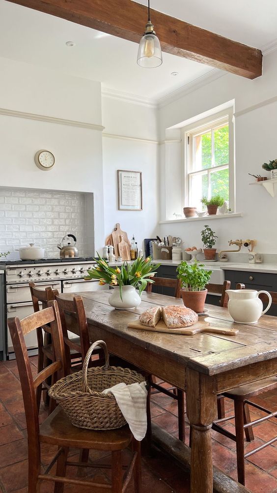 A vintage dining table with mismatched chairs brings a cozy, inviting feel to any kitchen. This setup is perfect for those who appreciate a touch of nostalgia and charm in their home. The round table, with its warm wood finish, creates a focal point that draws people in.