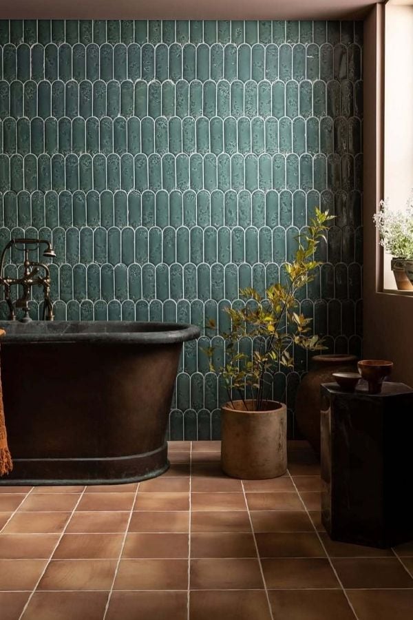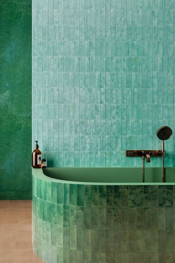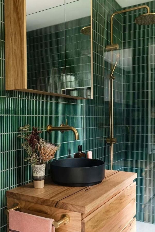 Deep green vertical tiles create strong lines that help stretch the height of the room, especially in tighter spaces. The glossy surface reflects light and keeps the color from feeling too dense.