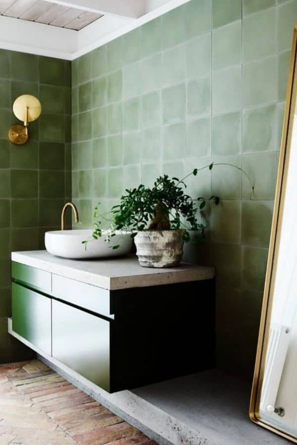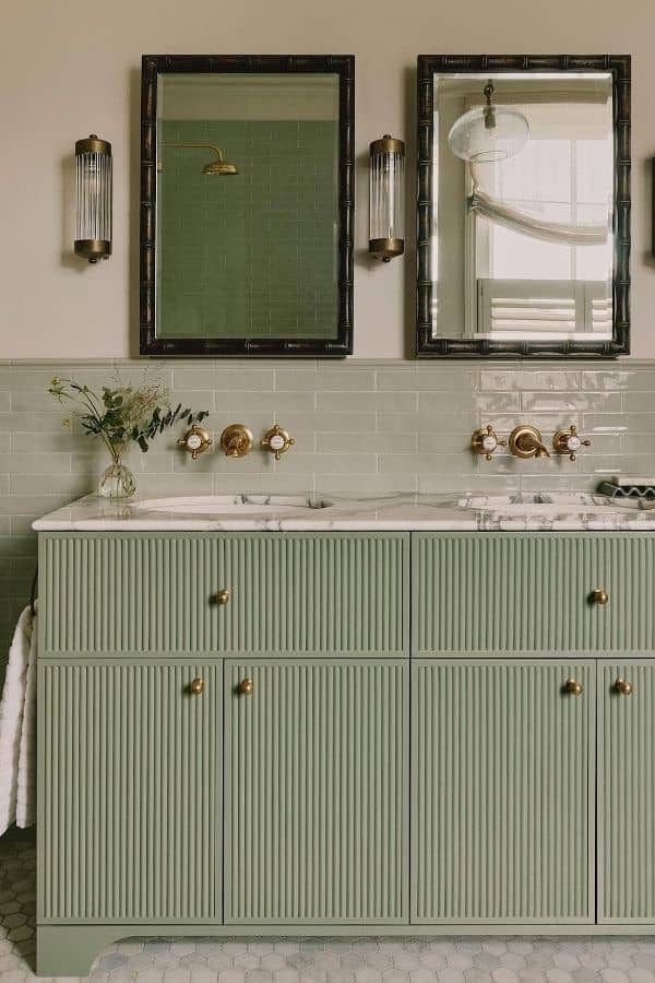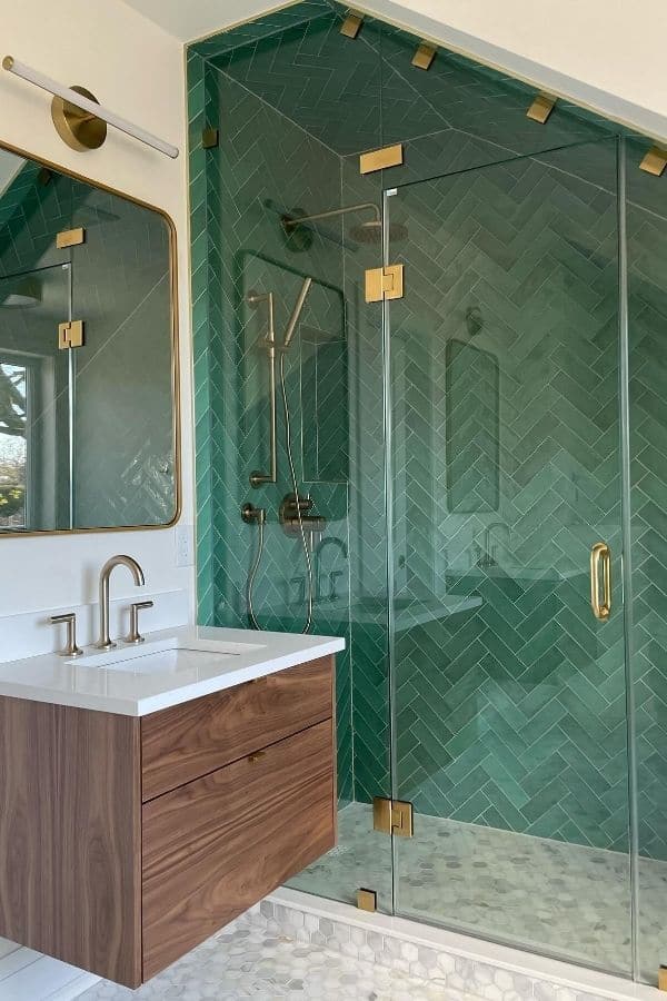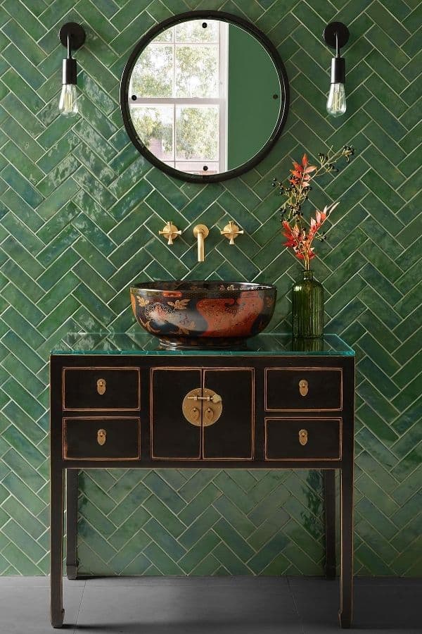 19. Green Herringbone Tiles with Bold Vanity Contrast
