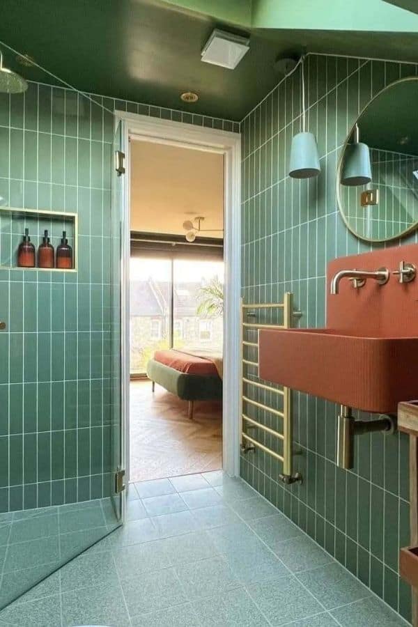 Covering walls in green tiles creates a bold look, but it works best in larger bathrooms where space can handle depth. It gives a cohesive feel.