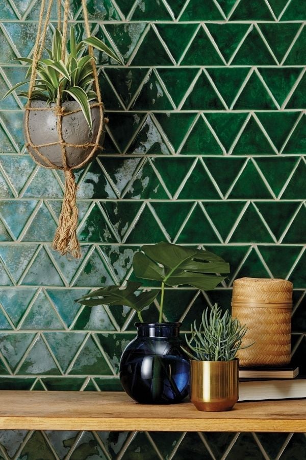 Glossy triangle tiles add movement and reflect light, which helps brighten deeper green shades in smaller bathrooms. The pattern feels more open instead of heavy.