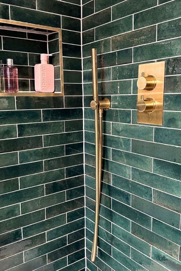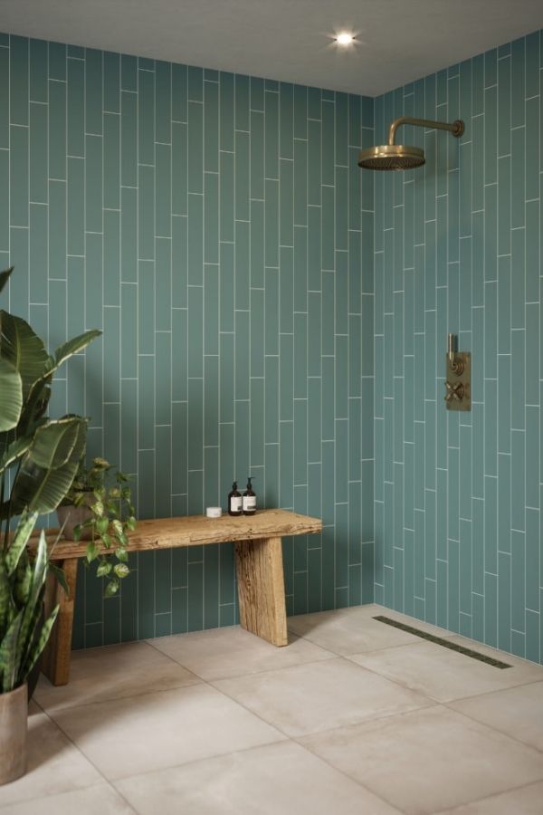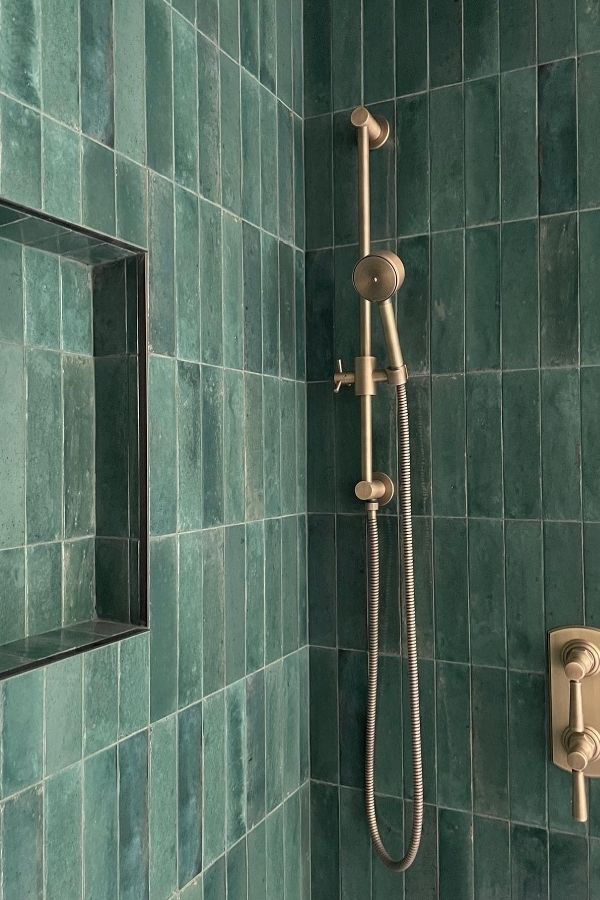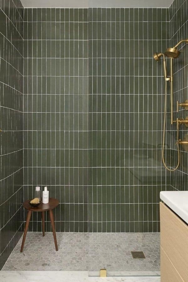 Deep green vertical tiles create a more enclosed feel, which works best in dedicated shower zones with defined boundaries. The color adds depth.