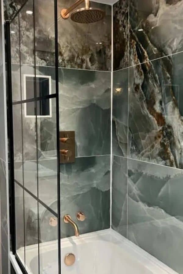 Marble effect tiles bring a bold, layered look that works best in larger shower areas where the pattern can spread naturally. It creates a strong visual impact.