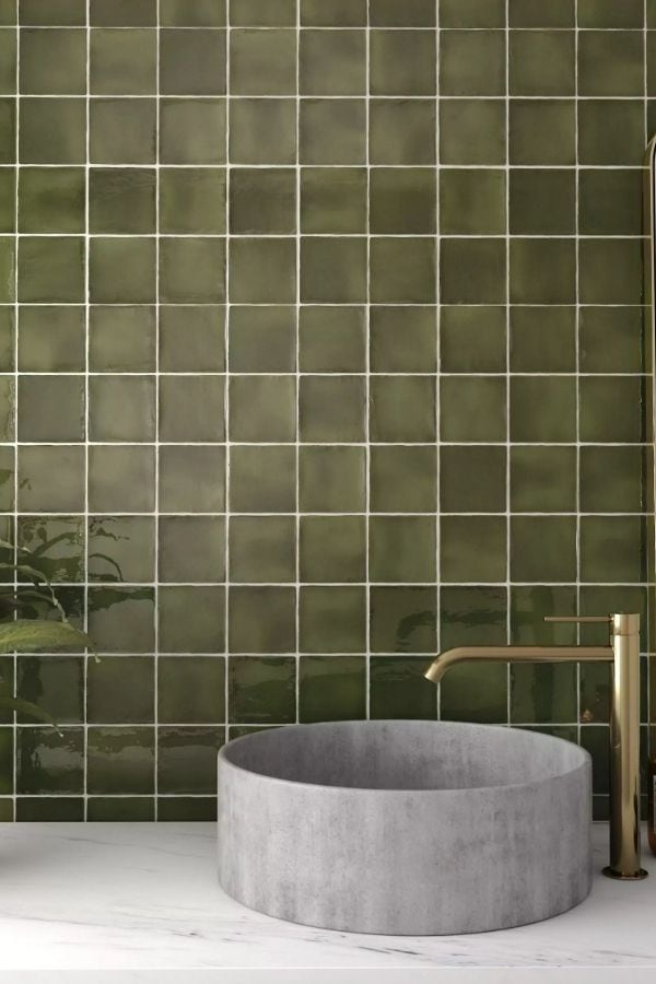 Olive green tiles offer a muted tone that works well in bathrooms with mixed lighting conditions. The color stays consistent without shifting too much.