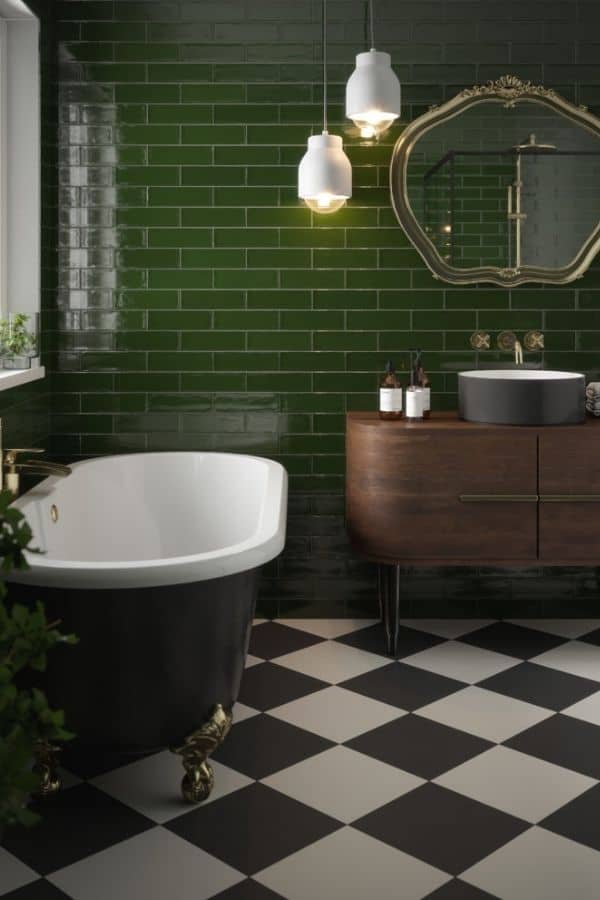 Dark green subway tiles create a strong backdrop that works well in bathrooms with bold flooring patterns. The contrast keeps each element clearly defined.