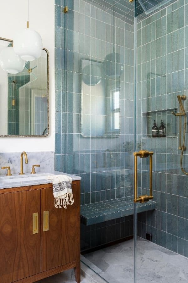 Blue-green tiles create a lighter feel that works well in bathrooms with limited natural light. The cooler tone keeps the space open.