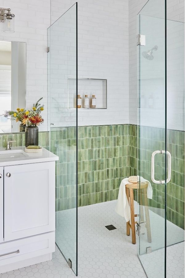 27. Deep Green Vertical Tiles for Enclosed Showers