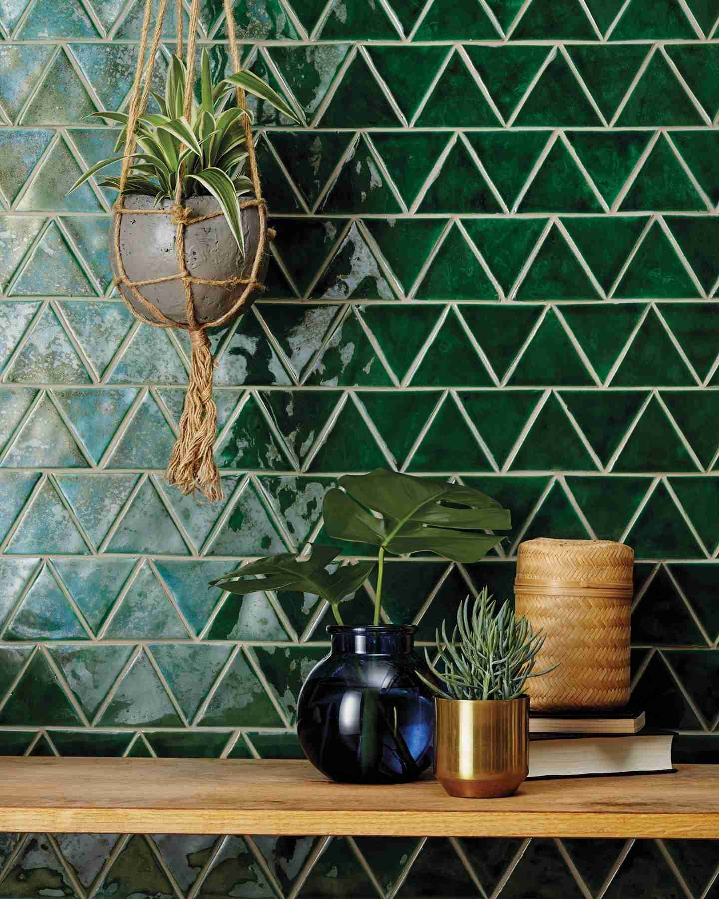 Triangle tiles introduce a geometric feel that adds movement, especially on smaller feature areas like backsplashes. The glossy finish enhances depth.