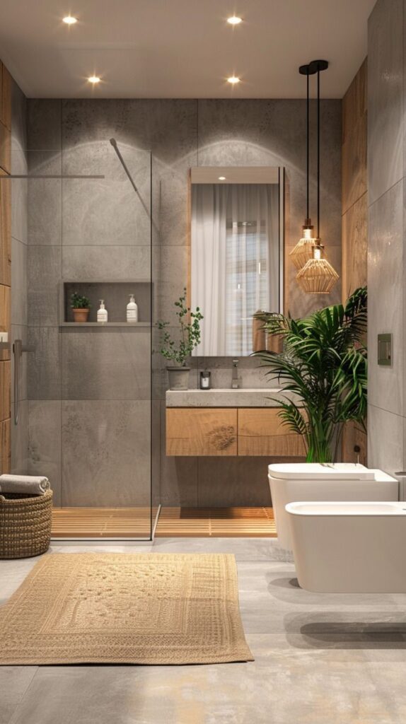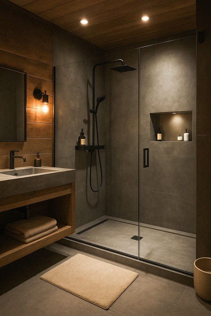 - Floor: large-format matte porcelain, concrete-look or stone-look