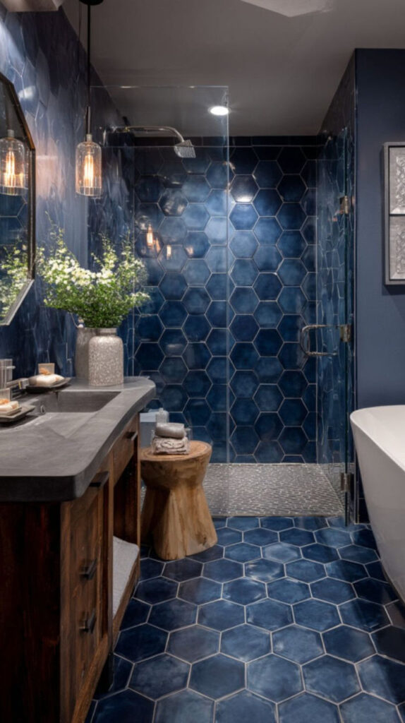 - Floor: small hex porcelain or marble-look porcelain