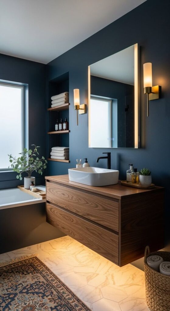 - Wall: warm stone-look porcelain or soft textured off-white