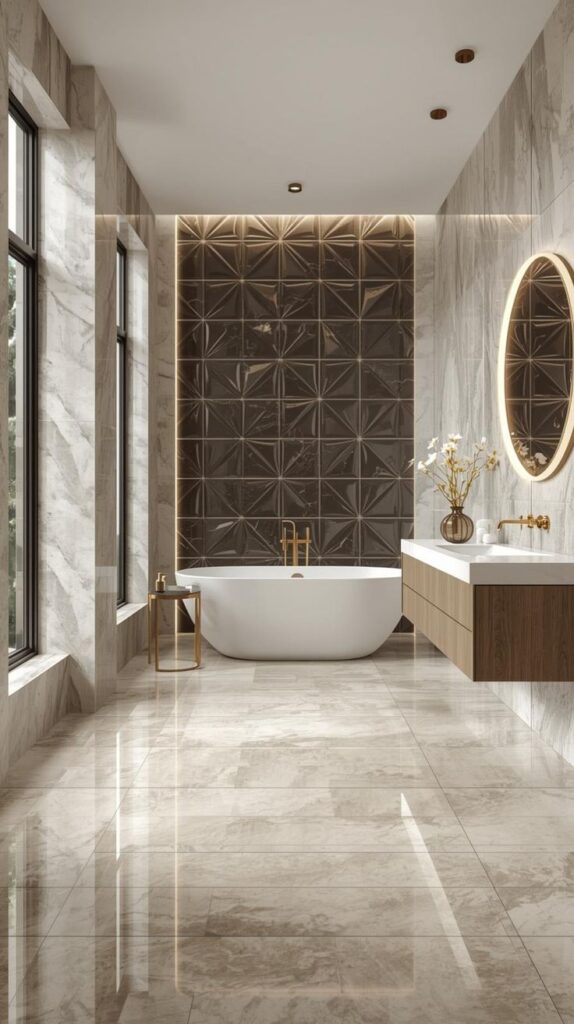 - Floor: large-format porcelain that mimics dramatic stone
