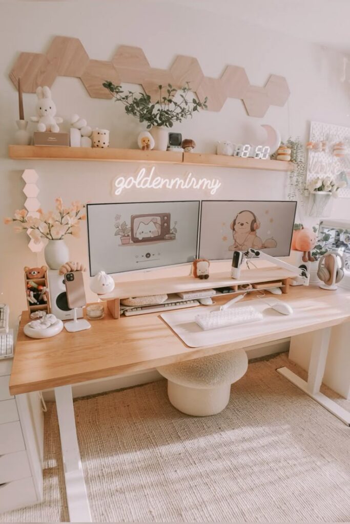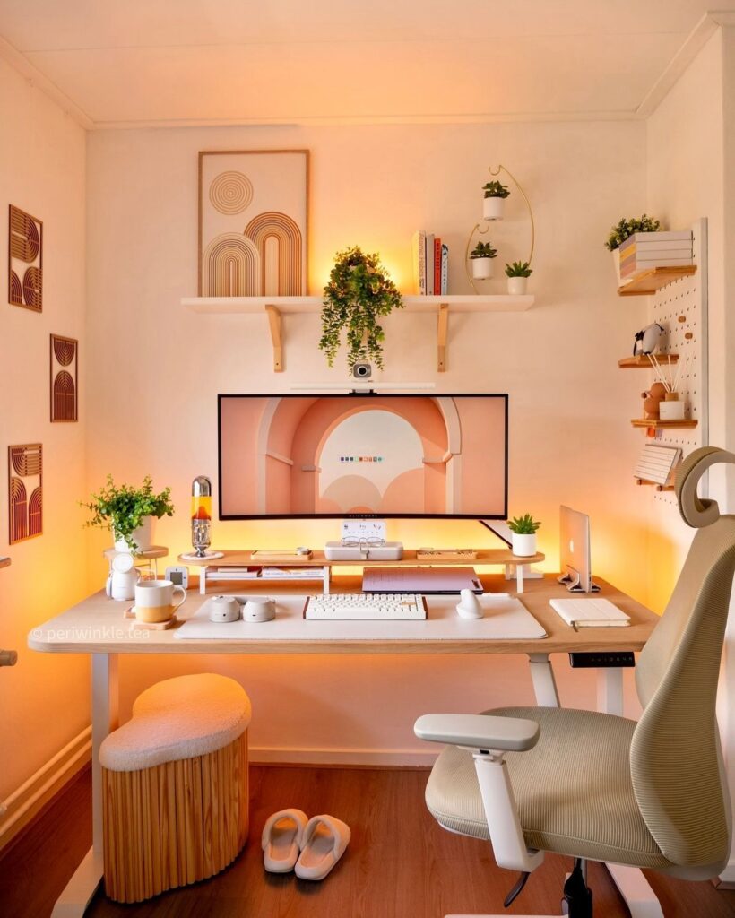 Use overhead lighting or a floor lamp to balance the room. Ambient light prevents harsh contrasts between your screen and the surrounding space, which reduces eye strain and makes the area feel more comfortable overall. A well lit room always feels calmer and more intentional.