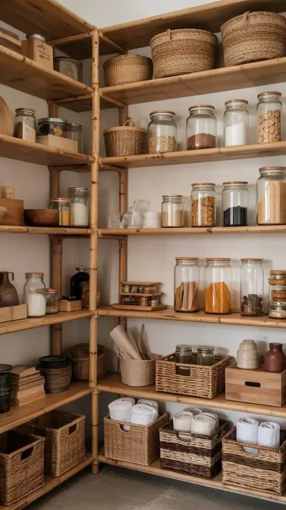 Bamboo storage has that warm, natural look that instantly makes a kitchen feel calmer. But beyond looks, it is also practical. Baskets and bins help you group ingredients and tools so you are not constantly shuffling items around shelves.
