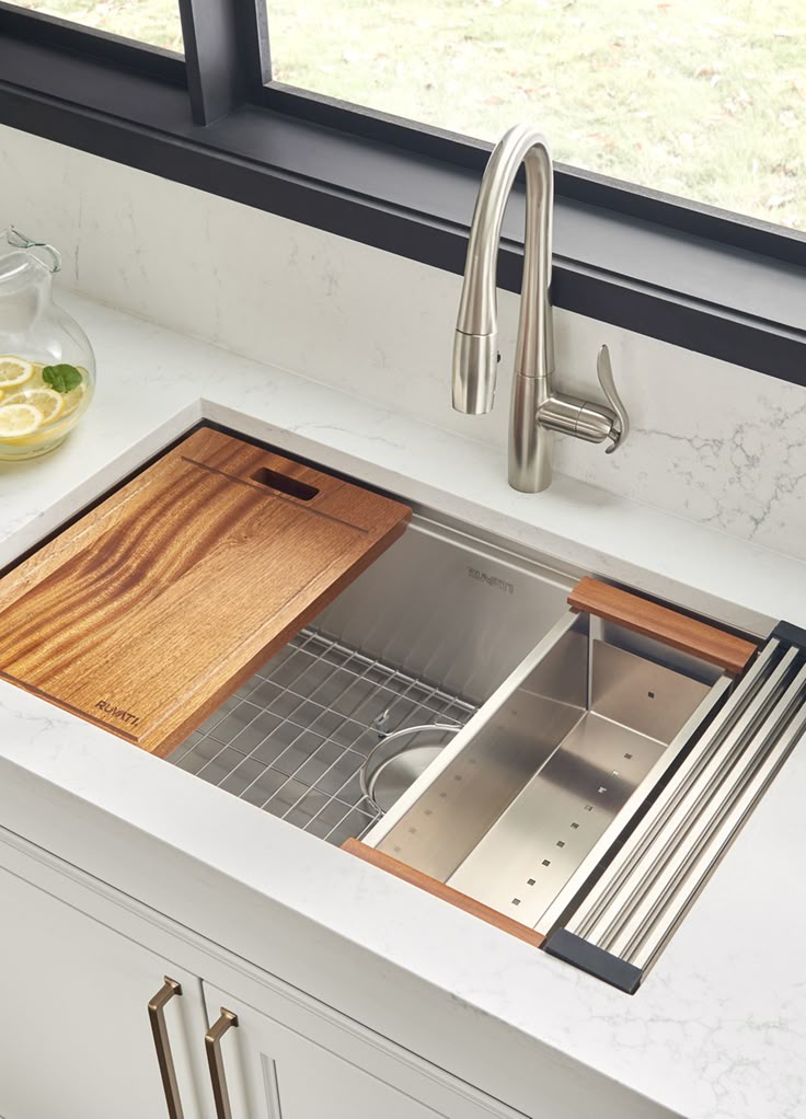 A workstation sink turns the sink area into a true prep zone. Built-in ledges for cutting boards, drying racks, and colanders make everyday tasks easier and reduce the need to spread prep work across the counters.