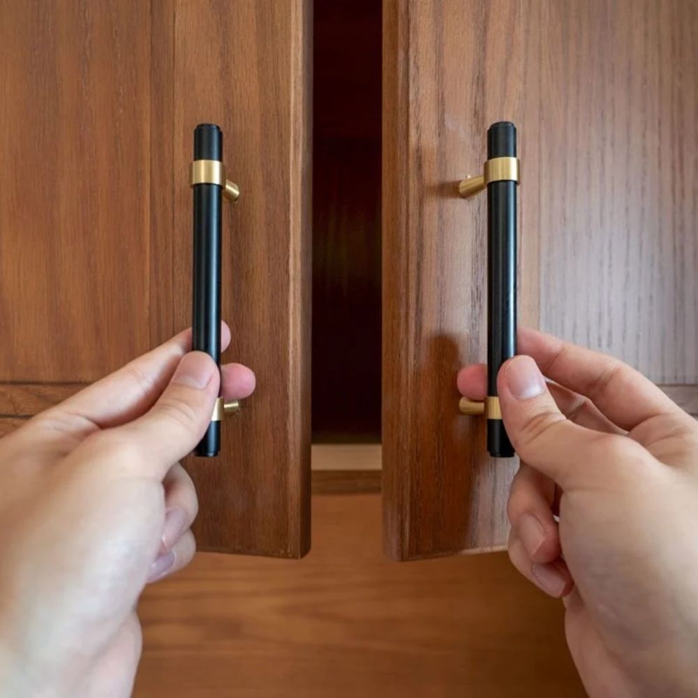 - Elongated pulls in a warm metal or matte black