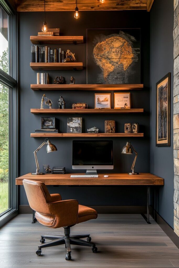 What makes it feel masculine isn’t the darkness alone — it’s contrast. A dark desk against lighter walls. A pale rug under a heavy wood table. A charcoal wall paired with warm leather. That push and pull keeps the space layered instead of flat.