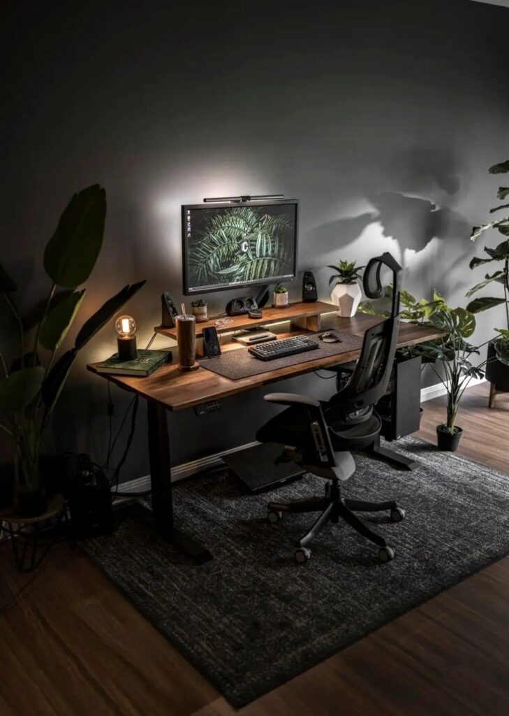 Use warm bulbs so the room glows instead of feeling harsh. Moody offices should feel enveloping, not clinical.